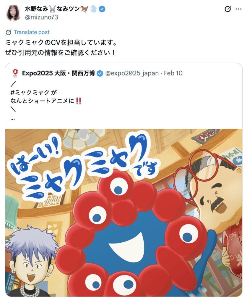 柔らかく少し不思議なトーンが、ミャクミャクの「不思議で親しみやすい存在感」を表現していると好評を集めました。